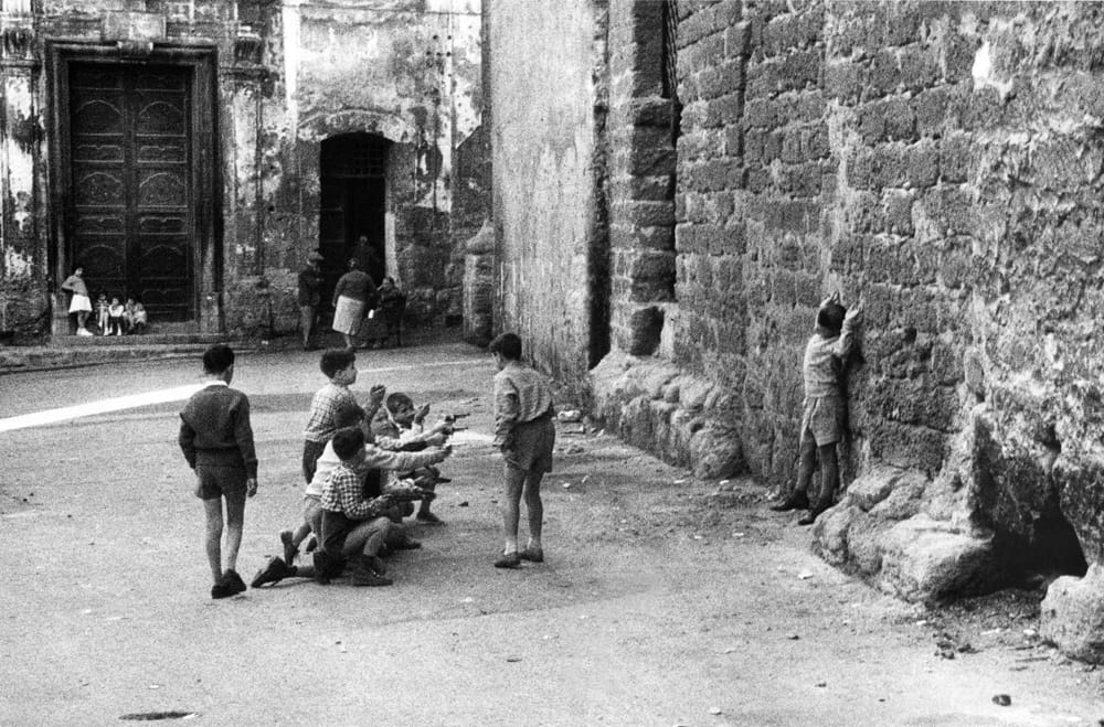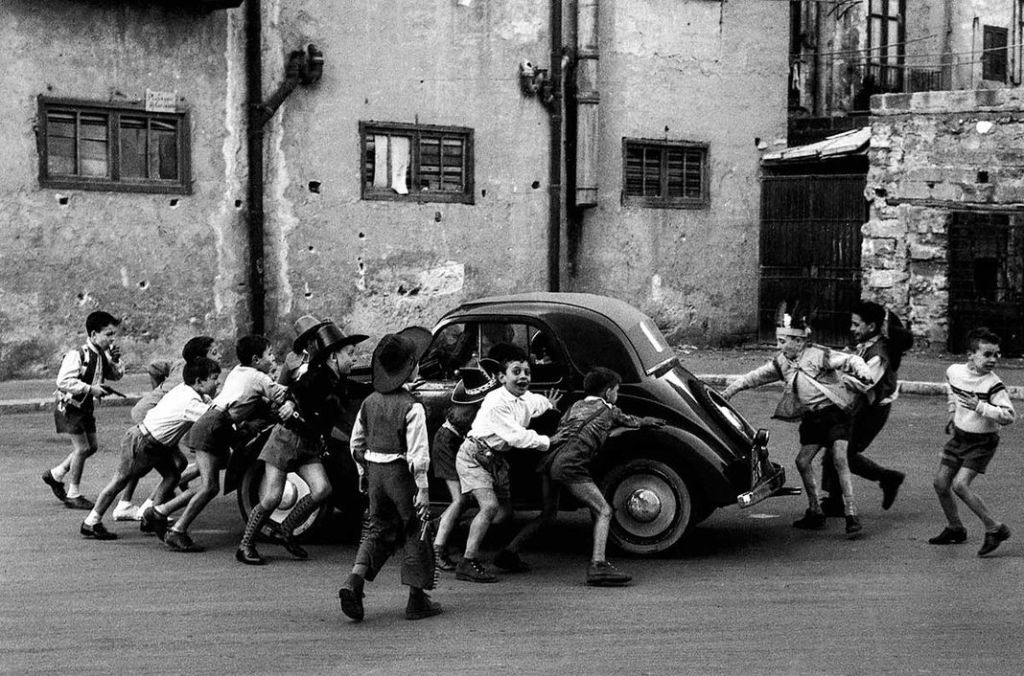 Il primo giocattolo, come diceva Sellerio alla figlia Olivia, è proprio la macchina fotografica, lo strumento che rende possibile una compartecipazione fantastica al mondo dei bambini, alla loro divertita redenzione della Storia. Una sorta di prisma, quell’oggetto che scompone la luce, rivelando un fascio di colori che si sostituisce al raggio ottusamente solo. Sicché nel gioco serissimo della fotografia la persistenza del dolore si apre quasi sempre, e secondo un principio ironico, al ventaglio multiforme dei suoi contrari. La composizione, l’inseguimento delle luci e delle ombre, in queste foto scattate tra gli anni ’50 e ’60, non ricerca mai una registrazione documentaria, ma una vera e propria narrazione. L’immagine fissata dal giocattolo non è morta a se stessa, metafora pungente di un’assenza, ma sembra includere il tempo: come in ogni gioco, un limite (sia esso una regola o una linea tracciata per terra) determina un movimento. Questa dinamica risulta spontanea, a mettere insieme i fotogrammi del racconto siamo noi spettatori, con la nostra emozione che – lontana dall’essere un trasalimento impalpabile – assume la consistenza e la forma di una mano che gira una manovella, permettendo ai bambini di Sicilia, sperduti nel tempo e nelle città, nei paesi dell’isola (Palermo, Cefalù, Randazzo ecc.), di incontrarsi nel cinema naturale della solitudine in cui ricordiamo o sogniamo.