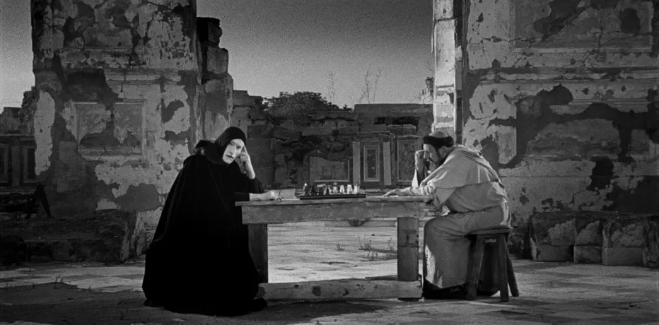 La morte, nerissima e affilata come la sua falce, insegue il santo idiota, il candido Peppino, e lo conduce – insieme ad una subdola carrellata – al tavolo da gioco. «Il pareggio non serve a nessuno» gli intima, e ciononostante la partita tarda a cominciare. Sono immobili, la notte ne prolunga i silenzi oltre il rudere che li accoglie, asseconda la concentrazione ottusa del santo e la stanchezza attonita del suo persecutore. Ma la partita non può cominciare, dal momento che Peppino non conosce le regole degli scacchi, e qualora il suo sfidante s’impegnasse finanche a spiegargliele di certo non si azzarderebbe a muovere un pezzo. Eppure rimane seduto perché la partita, se non può iniziare, non può neanche finire.